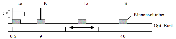 Lampe, Trafo, Verbindungskabel, optische Bank, Linsen, Schirm, Lineal (Messband), Kondensor, Klemmschieber