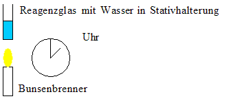 Stativmaterial, Uhr, Reagenzglas, Heizquelle, Thermometer