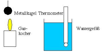 Das glühende Metallstück wird ins Wasserbad getaucht. Die Mischungstemperatur kann nach dem Umrühren bestimmt werden. Zügig arbeiten, da Wärmeverluste auftreten.